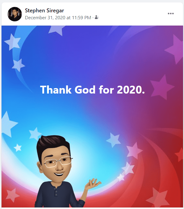 As each ticking of the clock brought us closer to midnight, in a counter-intuitiveness I wrote a Facebook post that said, “Thank God for 2020” with my avatar smiling. That’s it. I didn’t post any firework pictures with a bold “Goodbye 2020, Hello 2021!” Or the standard, “Happy New Year 2021!” No. I wasn’t sure what got into me that night, but I felt that in middle of the hailstorm of people congratulating each other for making in through the accursed 2020, the proper attitude was to be grateful.