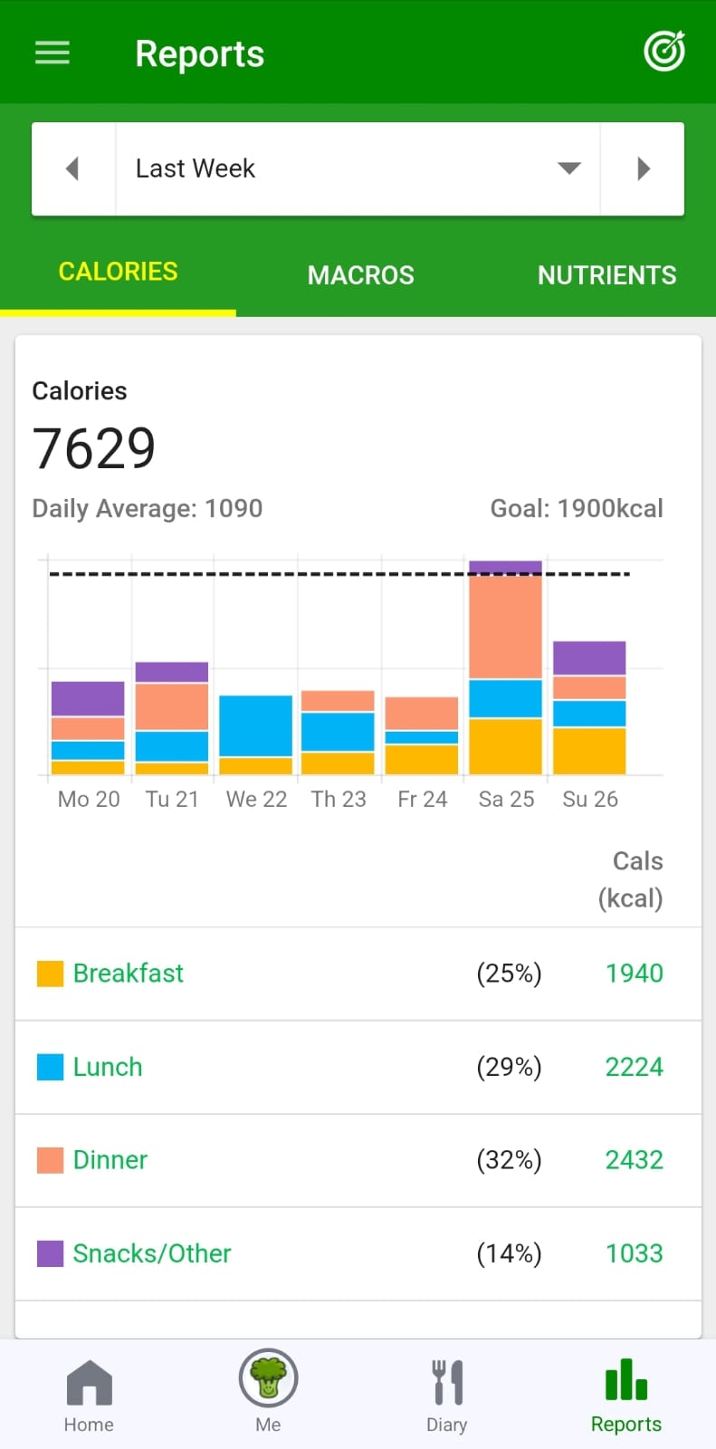 A couple of weeks ago I started what I imagined as a low-carb diet. In short, I tried to eat fewer carbs and more protein and fat. Using the fatsecret.com app, I found that my macronutrient consumption for the past week was like this.